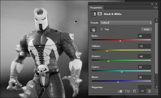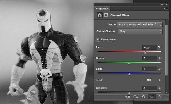Con eso en mente, vuélvase loco con los ajustes manuales. Todo lo que necesita hacer para usar el Mezclador de canales en modo manual es marcar la casilla Monocromo y ajustar los controles deslizantes hasta que esté satisfecho con su imagen.