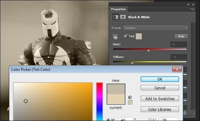 La otra herramienta de interés aquí es la herramienta Tinte. Si anhela un tono y tinte de la vieja escuela, puede agregar un tinte a su foto aquí sin la molestia de hacer otra capa de ajuste. Si marcamos Tinte, el tono predeterminado es de estilo sepia, pero puede hacer clic fácilmente en la muestra de color para elegir un color diferente.