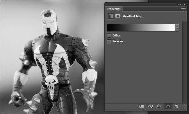 En tal caso, es el momento perfecto para acelerar su flujo de trabajo con algunos pequeños atajos. El primer atajo es usar el Mapa de degradado para volcar respetuosamente los valores de color de su foto mientras conserva el contraste y la riqueza de su imagen. Para hacerlo, vaya a Capa -> Nueva capa de ajuste -> Mapa de degradado. El mapa de degradado predeterminado es en blanco y negro (pero siéntase libre de buscar en el menú desplegable si está de humor para, por ejemplo, un degradado rojo y verde).