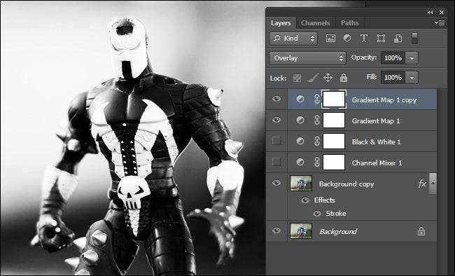 En la parte superior de la ventana de capas, donde dice "Normal" en un menú desplegable (al lado de Opacidad), tire del menú hacia abajo y seleccione "Superposición". Terminarás con un muy imagen intensa en blanco y negro como esta: