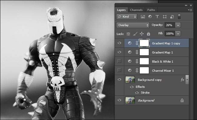 El truco de superposición y opacidad, por cierto, es excelente para aplicarlo a casi cualquier fotografía en blanco y negro con la que esté trabajando; somos grandes fanáticos de colocar una pequeña capa semiopaca en la foto en el final como un medio de enfatizar realmente el contraste de la foto.