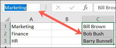 Enumere los elementos para la lista dependiente y luego seleccione las celdas. Esto coloca las células en un grupo para que pueda nombrar al grupo. Con las células seleccionadas, sube al cuadro Nombre en el lado izquierdo de la barra de fórmula y Ingrese un nombre para el grupo celular .