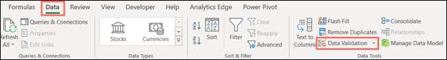 Seleccione la celda donde desea la lista. Luego, vaya a la pestaña Datos y haga clic en "Validación de datos" en la sección Herramientas de datos de la cinta.