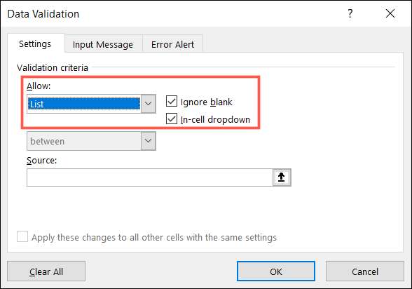 Elija la pestaña Configuración en la ventana emergente. En Permite, seleccione "Lista", y a la derecha, marque la casilla para desplegarse en la celda. Opcionalmente, puede marcar la casilla para ignorar las celdas en blanco si lo desea.