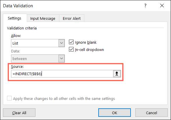En la caja de origen, ingrese la siguiente fórmula. Asegúrese de reemplazar la referencia celular entre paréntesis con la celda que contiene su primera lista desplegable.