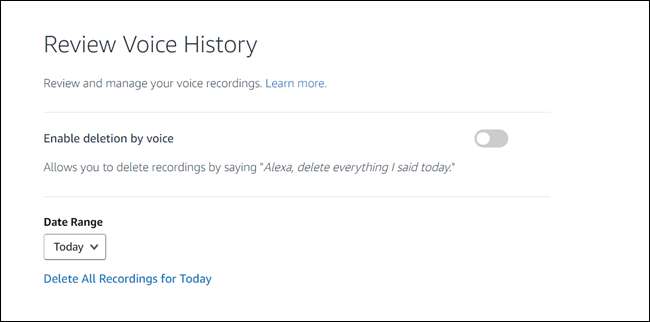 Para participar, inicie sesión en el Panel de privacidad de Alexa , haga clic en "Revisar historial de voz" y luego mueva la palanca "Habilitar eliminación por voz". Ahora podrás decir "borra todo lo que dije hoy". Según Engadget , también debería poder decir "eliminar lo que acabo de decir", pero eso no funcionó en nuestras pruebas, y el sitio de Amazon no hace ninguna referencia a ese comando. Quizás esa característica esté llegando.