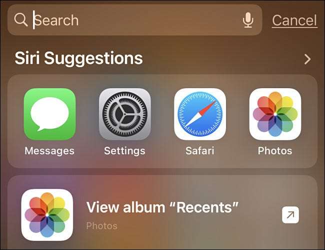 Aquí hay un ejemplo del tipo de sugerencias SIRI que aparecen mientras buscando desde la pantalla de inicio en un iPhone o iPad. Verá aplicaciones sugeridas que se enumeran justo debajo de la barra de búsqueda y también las posibles acciones como abrir ciertos álbumes de fotos o enviar mensajes a ciertas personas.