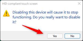 En el cuadro de diálogo que aparece, haga clic en "Sí" para confirmar que realmente desea deshabilitar la pantalla táctil.