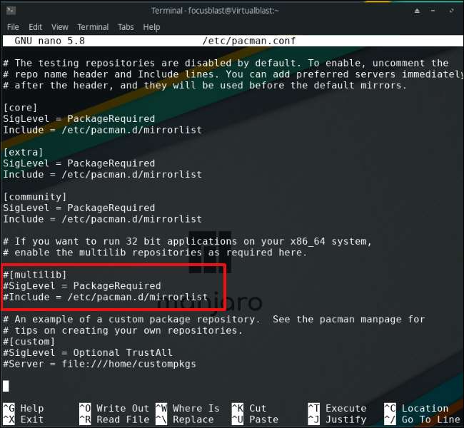 Desplácese hacia abajo, y encontrará la sección "Multilib" encerrada en "#". Un # en un guión le dice al sistema operativo que ignore la línea que contiene lo mismo. Estaremos eliminando los # 's para habilitar el repositorio multilib.