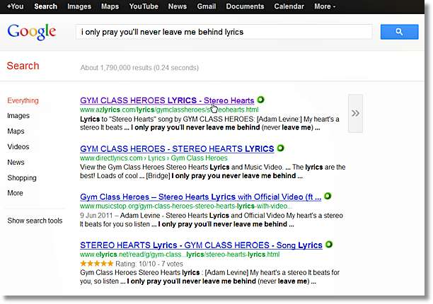 Por ejemplo, el otro día estaba escuchando una canción en la radio y todo lo que recordaba de toda la canción era una frase pegadiza, casi en la mitad de la canción. Intentemos buscarlo en Google.