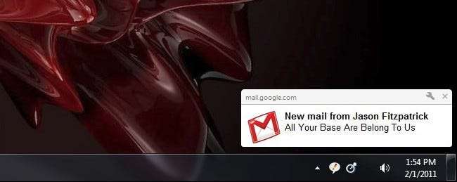Es hora de probarlo. Envío de un correo electrónico a la cuenta de Gmail desde la que acaba de habilitar las notificaciones (envíelo desde otra dirección de correo electrónico, a veces no recibe notificaciones si se las envía desde su dirección principal). Además, asegúrese de tener Gmail abierto en una pestaña en algún lugar de Chrome. Esto es importante; las notificaciones solo funcionarán si ha iniciado sesión en Gmail con Gmail abierto en una pestaña.