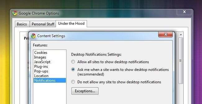 Antes de que puedas aprovechar el poder de notificación de Chrome, tendrás que activarlas. Haga clic en la llave inglesa en la esquina superior derecha y navegue hasta Opciones -> Avanzadas -> Configuración de contenido… y luego, desde el menú Contenido, navegue hasta Notificaciones . Allí deberías comprobar Preguntarme cuando un sitio quiera mostrar notificaciones de escritorio . Cierre el menú de opciones y regrese al panel principal del navegador en Chrome.