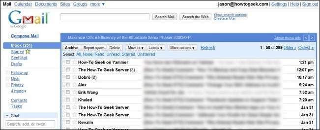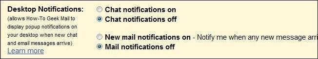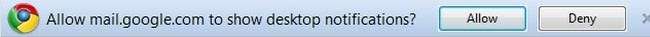 Primero, haga clic en el vínculo azul que dice " Haga clic aquí para habilitar las notificaciones de escritorio ... ”. Es probable que su enlace diga "para Gmail", en nuestro caso dice How-To Geek Mail debido a nuestro dominio de Google Apps. Al hacer clic en él, aparecerá una barra azul en la parte superior de su navegador que le preguntará si desea permitir que mail.google.com muestre notificaciones de escritorio. Hacer clic Permitir .