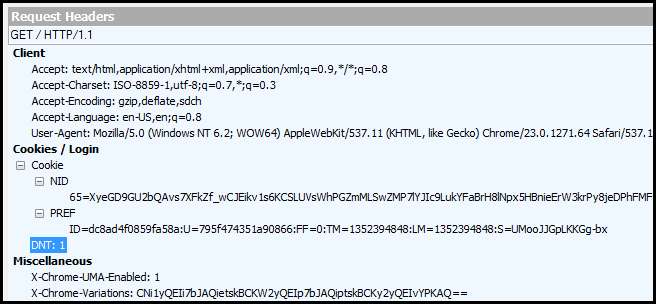 Una vez habilitado, decidí ejecutar algunas solicitudes a través de un proxy de depuración HTTP local para ver cómo difieren los paquetes, puede ver a continuación que el navegador ahora agregará una nueva cookie llamada DNT con un valor de 1 a todas sus solicitudes web.