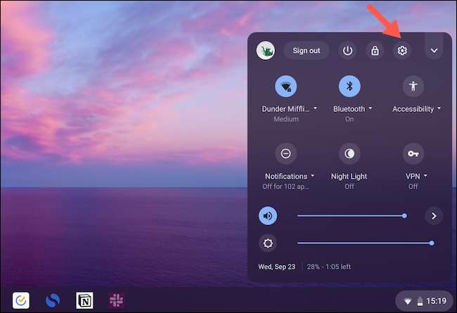 En su Chromebook, haga clic en la sección Estado que se encuentra en la esquina inferior derecha para revelar el panel de configuración rápida. Seleccione el icono de engranaje para ingresar el menú de configuración de su Chromebook.