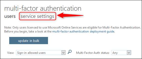 Esto lo llevará a la página de autenticación multifactor. Puede activar MFA inmediatamente para cualquier persona que esté usando su suscripción de Office 365, pero, antes de eso, es mejor familiarizarse con la configuración predeterminada. Para hacer esto, haga clic en "Configuración del servicio".