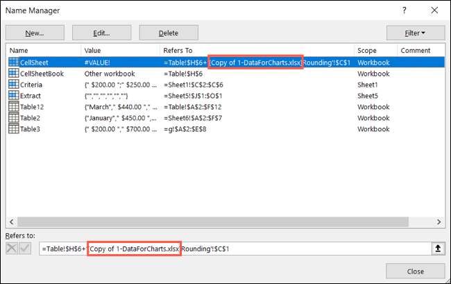 Cuando se muestra la ventana del administrador de nombres, puede buscar libros de trabajo en las columnas. Dado que tienen la extensión XLS o XLSX, debería poder detectarlos fácilmente. Si es necesario, también puede seleccionar uno para ver el nombre completo del libro de trabajo en el cuadro se refiere en la parte inferior de la ventana.