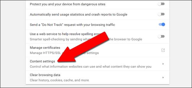 Desplácese hasta la parte inferior de la página y haga clic en "Avanzado". En el título "Privacidad y seguridad", haga clic en "Configuración de contenido".
