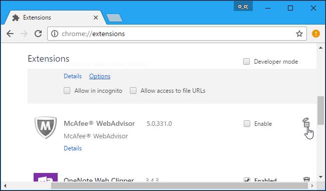 En Google Chrome, haga clic en el menú y seleccione Más herramientas> Extensiones. Haga clic en la papelera a la derecha de la extensión McAfee WebAdvisor para eliminarla.