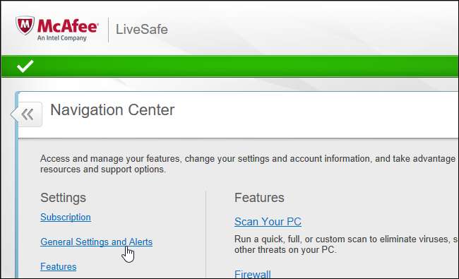 Haga clic en el enlace "Navegación" en el panel derecho de la ventana de McAfee y luego haga clic en "Configuración general y alertas" en Configuración.