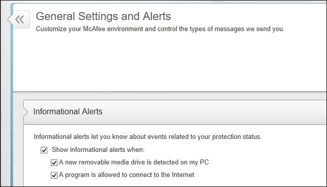 Haga clic aquí en las categorías "Alertas informativas" y "Alertas de protección" y elija qué tipo de mensajes de alerta no desea ver. Por ejemplo, puede decirle a McAfee que no muestre alertas cuando inserte unidades de medios extraíbles en su PC y cuando McAfee permita que los programas se conecten a Internet.