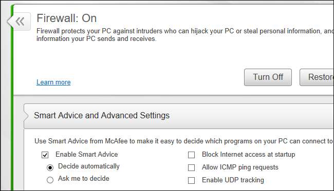 Para encontrar la configuración del firewall de McAfee, haga clic en el enlace "Inicio" en el lado derecho de la ventana de McAfee para acceder a la pantalla de inicio. En la pantalla de inicio, haga clic en Administrar seguridad> Protección web y de correo electrónico> Cortafuegos. Expanda la categoría "Consejos inteligentes y configuración avanzada" aquí y asegúrese de que esté configurada en "Habilitar consejos inteligentes" y "Decidir automáticamente".
