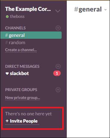 Para comenzar a configurar las cosas que mejor se adapten a las necesidades de su equipo, puede administrar los nombres de sus canales o crear otros nuevos junto con mensajes directos y grupos privados a través de la barra lateral. Si nadie se ha unido al canal todavía, puede usar el botón grande "Invitar personas" ubicado en la parte inferior de la barra lateral para comenzar a llenar su espacio de reunión.