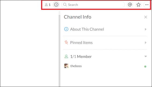 En la esquina superior derecha es donde encontrará otras herramientas útiles como la barra de búsqueda, el botón de información (muestra información y estadísticas sobre el canal actual) y la barra "Menciones" (anotado por el signo "@") , que mostrará una lista de todas las veces que se marcó su nombre de usuario en el chat en caso de que se haya perdido información importante que se le envió.