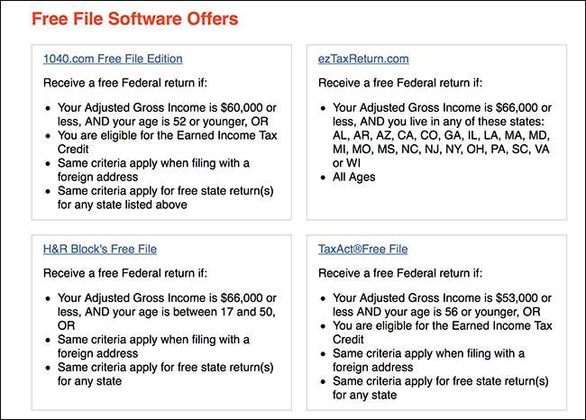 Puede pensar que su única opción es aceptar eso, pero si ganó menos de $ 66,000, en realidad existe un método oficial y verdaderamente gratuito: Free File del IRS . Esta es una asociación entre el IRS y varias empresas de preparación de impuestos diferentes, y le ofrece software gratuito para elaborar y presentar sus impuestos en línea. Empresas como TurboTax y Bloque H & R están aquí, ofreciendo versiones gratuitas de su software que no intentarán venderle más.
