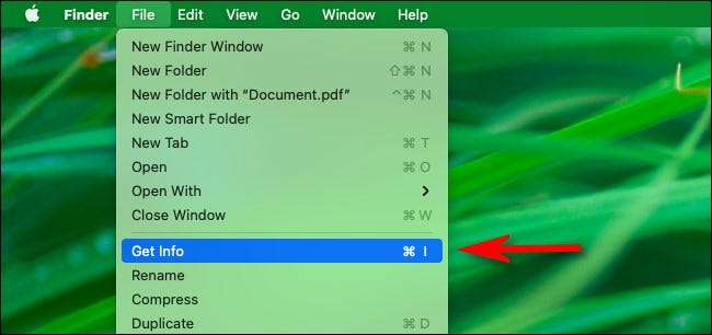 [dieciséis] Cómo ocultar o mostrar extensiones en archivos específicosA continuación, le indicamos cómo mostrar u ocultar una extensión de archivo individual si "Mostrar todas las extensiones de archivo" está deshabilitado en el buscador. Primero, localice el archivo cuya extensión le gustaría mostrar u ocultar en una ventana de Buscador. Seleccione el archivo, luego elija "Archivo" y GT; "Obtener información" en la barra de menú. (O puede presionar Comando + i en su teclado).