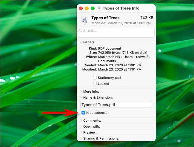 Cuando aparece la ventana "Obtener información", desplácese hacia abajo hasta que vea el "Nombre y amplificador; Sección de extensión ". (Haga clic en el quilote al lado del encabezado para expandirlo si es necesario). Luego verifique o desmarque "Ocultar la extensión". Si lo designa, la extensión será visible. Si está marcado, la extensión se ocultará.