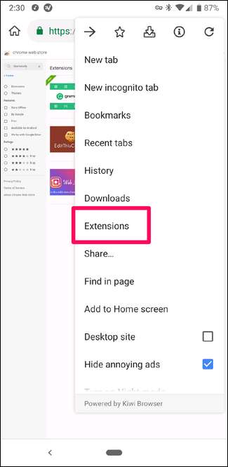 Si se da cuenta de que una extensión no es lo que pensaba que sería (o simplemente desea eliminarla), toque el botón de menú en la esquina superior y luego seleccione "Extensiones".