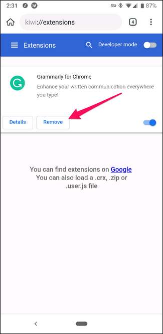Ahora, dicho todo esto, Kiwi todavía ha hecho algo extraordinario aquí al habilitar esta función, y funciona tan bien como es posible, dado el estado de las extensiones de Chrome en este momento. La instalación y eliminación de extensiones (las cuales cubriremos a continuación) son tan simples como pueden ser.