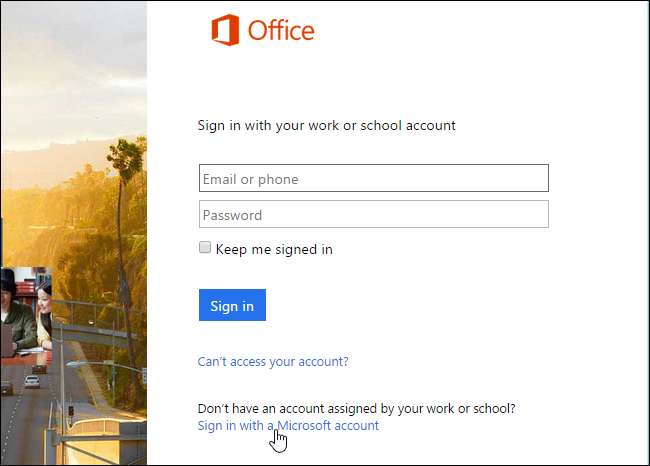 Puede ver la página que se muestra a continuación. Si compró su suscripción a Office 365 con una cuenta profesional o educativa, inicie sesión en esa página. Sin embargo, si utilizó una cuenta personal de Microsoft, haga clic en el enlace "Iniciar sesión con una cuenta de Microsoft" e inicie sesión en la página web resultante.