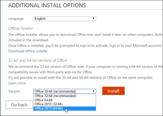 En la pantalla "Opciones de instalación adicionales", seleccione "Office 2013 (32 bits)" u "Office 2013 (64 bits) en la lista desplegable" Versión ", según la tipo de sistema que estás ejecutando .