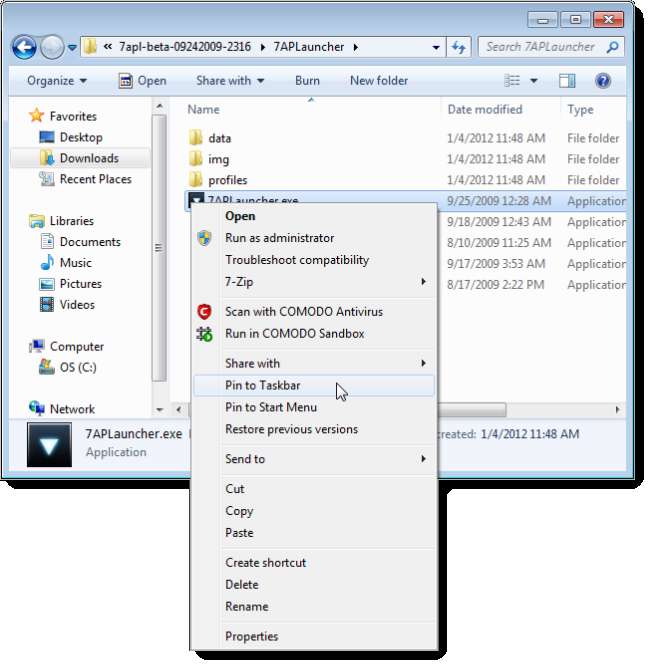 Si desea poder ejecutar perfiles desde una lista de salto, haga clic con el botón derecho en el archivo .exe 7APL y seleccione Anclar a la barra de tareas en el menú emergente.