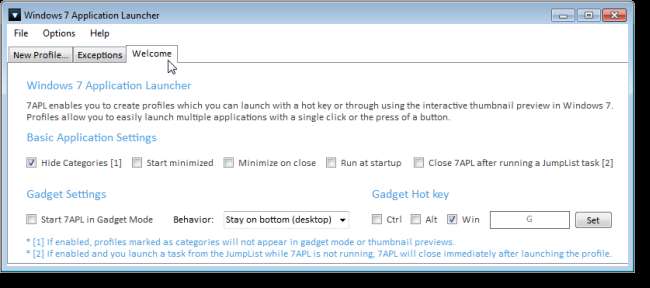 Encontramos una utilidad pequeña y portátil para Windows 7, llamada Windows 7 App Launcher (7APL), que le permite iniciar varias aplicaciones a la vez usando una tecla de acceso rápido o la función de listas de salto de Windows 7. Crea perfiles que contienen todas las aplicaciones que desea iniciar a la vez y aplica una tecla de acceso rápido a cada perfil.