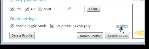 Puede utilizar la lista de salto en el icono de la barra de tareas de 7APL para iniciar aplicaciones independientes dentro de un perfil. Esto hace que 7APL actúe como un pequeño lanzador de aplicaciones. Cada perfil que crea se convierte en una categoría. Para establecer un perfil como categoría, seleccione la casilla de verificación Establecer perfil como categoría en Otras configuraciones. Haga clic en el enlace de configuración que se muestra.