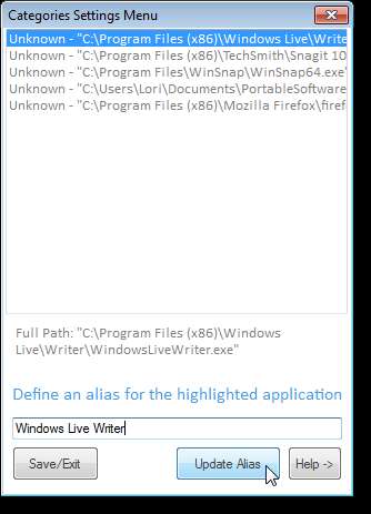 El alias de cada aplicación se muestra antes de la ruta completa en el cuadro de lista. Cuando haya creado un alias para cada aplicación, haga clic en Guardar / Salir para guardarlos y cerrar el cuadro de diálogo.