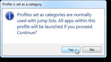 Ahora, cuando hace clic en el botón de flecha verde hacia arriba en la vista previa en miniatura, aparece el siguiente cuadro de diálogo. Si desea iniciar todas las aplicaciones en el perfil, haga clic en Sí. Este cuadro de diálogo también se muestra si tiene activado el modo Alternar para un perfil configurado como categoría y presiona el botón de flecha verde hacia arriba nuevamente después de abrir todas las aplicaciones en el perfil.