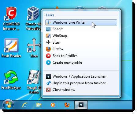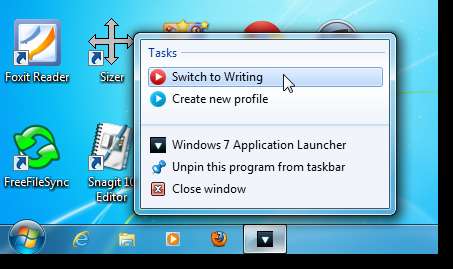 Para abrir un perfil que establezca como categoría, haga clic con el botón derecho en el icono de la barra de tareas de 7APL. No es necesario que el programa 7APL esté abierto para hacer esto. Aparece la lista de salto. El perfil se muestra en la sección Tareas con un botón rojo de flecha hacia la derecha a la izquierda del nombre. Se ha añadido "Cambiar a" al nombre del perfil en lugar de "Iniciar". Por ejemplo, nuestro perfil se convierte en Cambiar a escritura como categoría. Seleccione la tarea Cambiar a <nombre de perfil> para abrir la categoría.