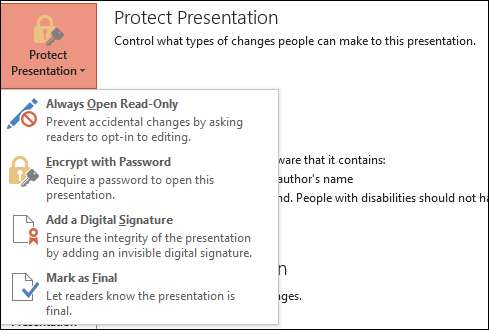 Ahora verá una sección de "Proteger Presentation", que le permite (hasta cierto punto) proteger contra cualquier edición de su presentación. Haga clic en "Proteger la presentación".