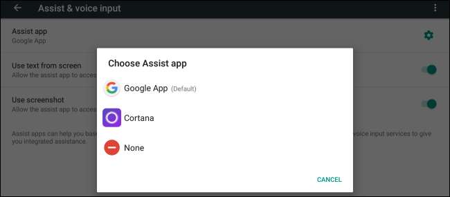 En Android 5 y versiones anteriores, la configuración de su asistente predeterminado funciona de la manera tradicional. Cuando usted instalar Cortana y mantenga presionado el botón de inicio, o use cualquier otro acceso directo del botón de inicio que use su dispositivo en particular para iniciar su asistente, se le preguntará si desea usar Google o Cortana como su asistente.