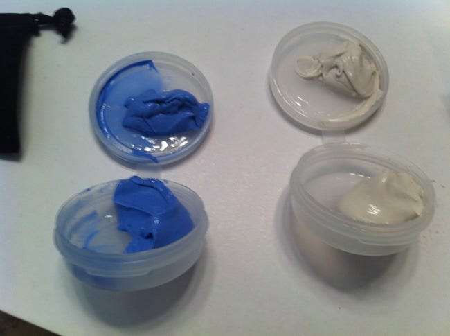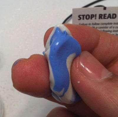 Aquí están las masillas separadas. La masilla viene en dos gotas separadas. Cuando amasas las dos partes juntas, eso provocará la reacción que permitirá que se asiente. Si sus orejas son lo suficientemente pequeñas, es posible que pueda usar la mitad para ambas orejas, por lo que puede crear un conjunto de respaldo.