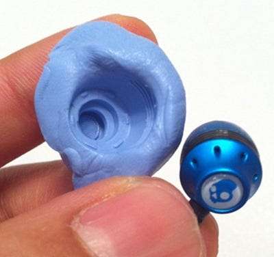 Al principio me preocupaba que la masilla se adhiriera demasiado al plástico de los auriculares, por lo que no probé esto con mis Shures. Tienen un tubo largo y no quería que se quedara atascado dentro. El molde de silicona en realidad no se adhiere al plástico, pero definitivamente tiene un ajuste perfecto. Cuando haga mis Shures, me aseguraré de tapar cuidadosamente los tubos antes de ponerlos en la masilla. La pequeña cresta / valle en Skullcandies hace que no se separen fácilmente del molde terminado, lo que puede ser bueno o malo según su preferencia.
