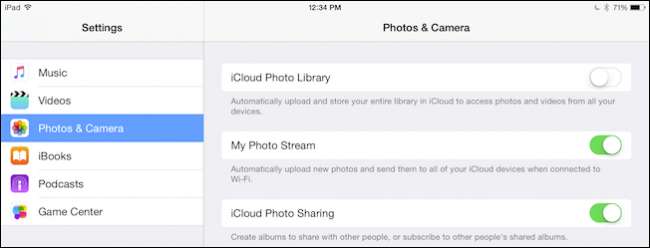 Ahora, verá que las mismas tres opciones que vio en su Mac también están aquí. En el siguiente ejemplo, verá que "iCloud Photo Library" no está habilitado. Esto significa que aunque vemos todas nuestras fotos cargadas desde nuestra Mac en nuestro iPad, no veremos ninguna foto en nuestro iPad en nuestra Mac.