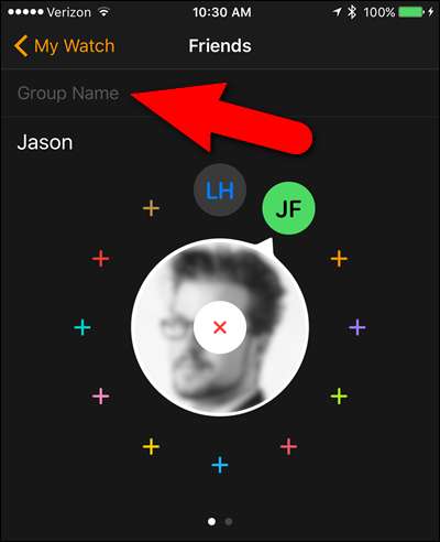 Escribe el nombre de tu grupo y toca "Listo" en el teclado en pantalla cuando hayas terminado. La etiqueta se mostrará brevemente cuando acceda a ese grupo de amigos en su reloj y luego se reemplaza con el nombre del contacto seleccionado.