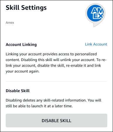 Para deshabilitar la cuenta de la cuenta a través de la aplicación Alexa, abra su aplicación Alexa, visite la página de Habilidades American Express o Capital One, luego toque "Deshabilitar". Esto eliminará su cuenta y evitará que Alexa accediera a él para obtener cualquier información.
