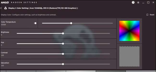 Desde aquí puede ajustar los valores de temperatura de color, brillo, tono, contraste y saturación. Los controles no son tan finos como los de NVIDIA, pero aún puede usar las imágenes de referencia a la derecha para comparar los colores con otras pantallas y mover la ventana hacia adelante y hacia atrás.
