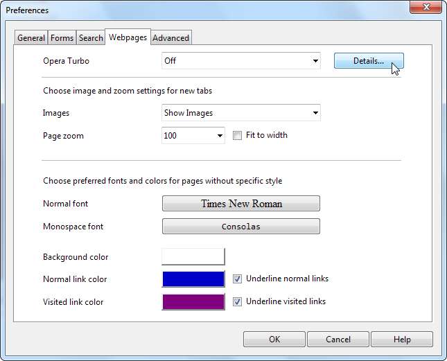 Haga clic en la pestaña Páginas web y verá la configuración de Opera Turbo cerca de la parte superior de la ventana.